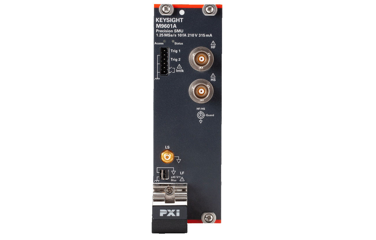 Keysight M9601A is a PXIe precision source/measure unit (SMU) with the capability to source and measure both voltage and current. It covers currents from 10 fA to 315 mA, and voltages from 500 nV to 210 V, and has the capability to make precise measurements from DC to pulsed down to 20 μs pulse width with the sampling rate up to 1.25 MSa/s. That makes the M9601A ideal for a wide variety of current versus voltage (IV) measurement tasks that require both high resolution and accuracy. You now can accurately perform characterization, parametric/reliability tests of semiconductors, active/passive components, and general electronic devices.